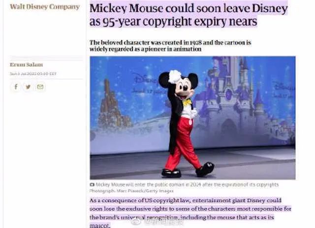 隨著“米老鼠”95年版權保護期的臨近,迪士尼或將失去這個最具代表性的卡通形象專有版權。從2024年起,“米老鼠”形象將進入公共領域——注意了,前提是,迪士尼不能像過去一樣,再次為其延長版權。